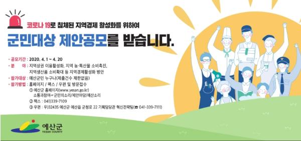 예산군은 코로나 19로 침체된 지역경제에 활력을 불어넣기 위해 군민을 대상으로 4월 20일까지 지역경제활성화 아이디어 제안을 공모한다고 밝혔다.