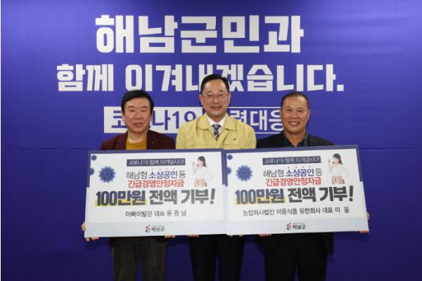 해남군 아빠이발관 윤종남 대표와 이웅식품 대표 이웅씨는 22일 해남군에서 지급받은 긴급경영안정자금 각 100만원씩을 기부했다.