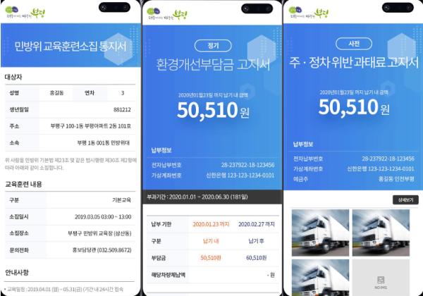 또 일부 지방정부에서 시행하고 있는 전자고지 서비스는 대상자들이 신청한 경우에만 서비스를 받을 수 있었지만, 부평구의 모바일 전자고지는 행정·공공기관이 보유한 주민등록번호를 중계사업자가 보유한 자료와 연계한 정보(CI)로 변환하는 기술을 도입해 별도의 신청 없이도 이용이 가능해졌다.