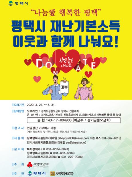 평택시는 24일, 저소득 가구와 사회복지시설 등 코로나19로 어려움을 겪는 이웃들을 위해 평택행복나눔본부, 경기사회복지공동모금회와 함께 재난기본소득 기부 ‘나눔愛 행복한 평택’ 특별모금을 전개한다고 밝혔다.