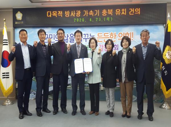 괴산군의회 의원 8명은 23일 열린 286회 괴산군의회 임시회 2차 본회의에서 다목적 방사광가속기를 충북에 유치해야 한다는 건의문을 만장일치로 채택했다.