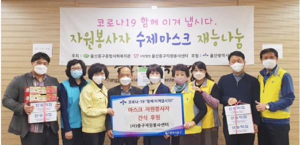 사단법인 울산 중구자원봉사센터(이사장 김문걸)는 1일 오전 10시 50분 중구 종합사회복지관을 방문해 지역 내 마스크 제작 자원봉사자들을 위한 간식을 후원했다.