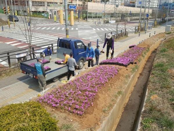 시는 지난해 10월부터 시 직영 양묘장에서 생태지킴이, 지역공동체 사업을 활용해 봄맞이 꽃 식재를 준비해왔다. 이번에는 봄철 내 꽃잔디, 무스카리, 돌단풍, 맥문동, 수선화, 비비추 등 초화류 8종, 약 5만본을 출하했다. 출하한 초화류는 관내 공원·녹지 및 가로변 22개소에 식재해 도심 곳곳에 봄 분위기를 더했다.