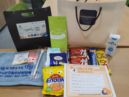 코로나19 극복 긴급물품 키트는 간식, 식료품, 양말, 수건, 학용품, 마음방역 수칙 안내문으로 구성되어 있고, 사상구 청소년상담복지센터 내담자 48명을 대상으로 전달했다.