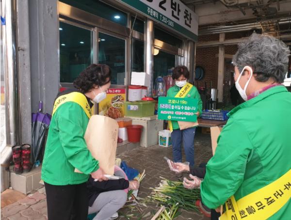 부녀회원들은 고강도 사회적 거리두기가 시행되면서 지쳐가는 시장상인들과 시장을 찾은 주민들에게 희망 손수건을 제작해 나눠주며 코로나19 예방을 위한 손 씻기를 당부했다.