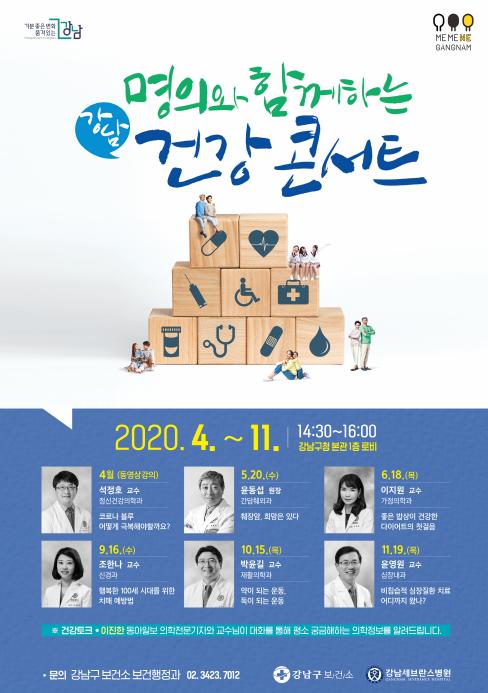 구는 사회적 거리두기가 종료되는 내달부터 11월까지 분야별 명의를 초빙해 구청 1층 로비에서 건강콘서트를 진행할 예정이다. △윤동섭 강남세브란스병원장이 ‘췌장암, 희망은 있다’(5월 20일) △이지원 가정의학과 교수가 ‘좋은 밥상이 건강한 다이어트의 첫걸음’(6월 18일) △조한나 신경과 교수가 ‘행복한 100세 시대를 위한 치매 예방법’(9월 16일) △박윤길 재활의학과 교수가 ‘약이 되는 운동, 독이 되는 운동’(10월 15일) △윤영원 심장내과 교수가 ‘비침습적 심장질환 치료 어디까지 왔나’에 대해 강의하고 질의응답 시간을 갖는다.