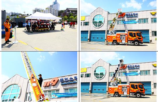 강원소방본부가 2020. 4. 23.(목) 13:30, 춘천소방서 야외주차장에서 전국최초 자동 바스켓 장착 다목적 경형 사다리차 시연회를 열었다.